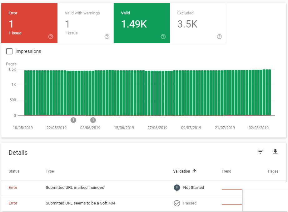 Top Tip: Pay attention to how many pages have been indexed, compared with the number of excluded pages. A disproportionate number of exclusions may indicate thin content (pages which don’t contain any valuable information).